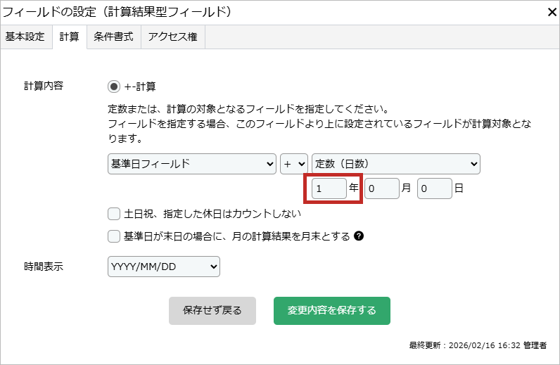 - 計算結果型フィールドで年単位の加算・減算を行っている