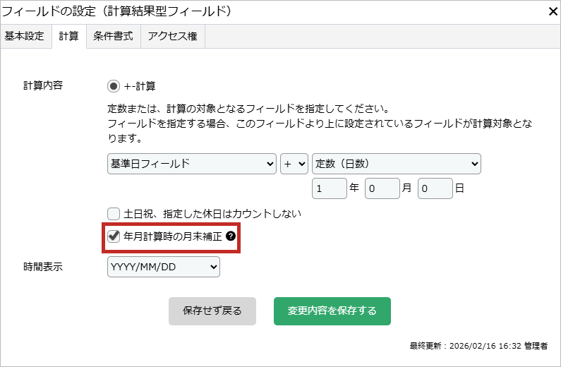 ※「年月計算時の月末補正」チェックボックスは、既存の「基準日が末日の場合に、月の計算結果を末日とする」チェックボックスの名称を変更する予定のものとなります。